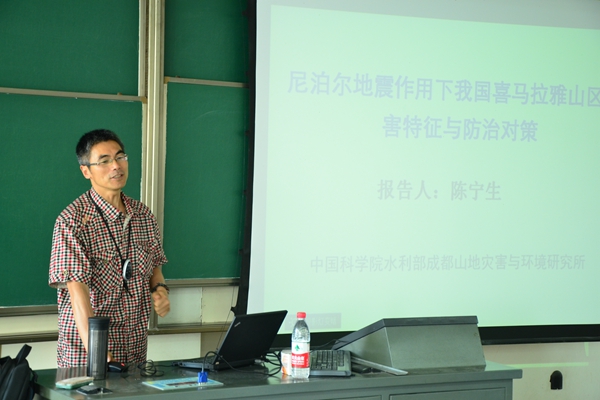 首先,姚教授郑重的介绍了陈宁生研究员,并对他的到来表示了热烈的欢迎。紧接着,陈研究员从地形特征、地质构造、地层岩性和水文地质条件等方面介绍了喜马拉雅山的区域背景。陈研究员以图文并茂的方式介绍了我国喜马拉雅山,尤其是樟木镇的地震、滑坡和冰湖溃决等重大灾害事故,给在座的同学强调了我国喜马拉雅山附近地质灾害的严重性和治理的迫切性。接着,他介绍了今年4月25日发生在尼泊尔的8.1级大地震对我国喜马拉雅山的影响,并指出它中国的灾害损失主要具有房屋损毁率高、人员伤亡人数少的特点,极大的褒奖了我国军民在地震中团结一致的行为。随后,他总结了我国喜马拉雅山附近地质灾害具有地质灾害险情严重、周期长等特点,提出了应以已发地质灾害和潜在地质灾害并重的原则来处理这些灾害。他指出喜马拉雅山处于我国和尼泊尔地区的交界部位,它的经济、文化和国防意义都极为重要,因此研究这一地区的灾害防治对策尤其重要。通过分析地震和土体失稳产生泥石流的机理,陈研究员提出喜马拉雅地区应进行全面的烈度评估和地质灾害评估,然后在这一基础上对滑坡、冰湖溃决问题进行地质灾害的综合防治方案,并指出应对跨界河流进行综合预警。