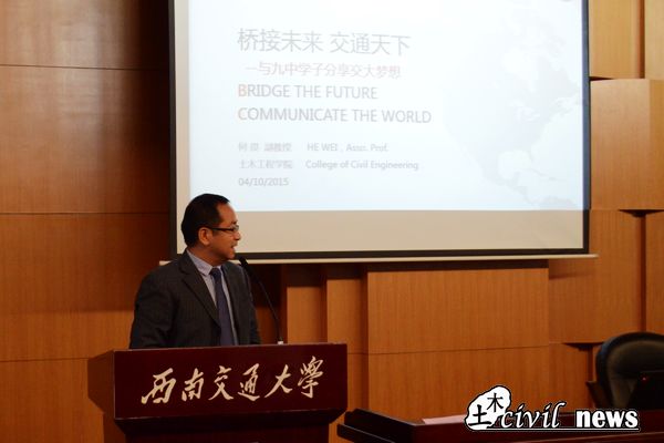 桥梁工程工程系何畏副教授则在最后向大家介绍了西南交大的校徽的由来以及建校史和在历史上、国际上取得的优异成绩。他这样说道:“正如校徽所彰显的土木人杰一样,从土木工程走出的学子们都拥有着踏实、肯干、吃苦耐劳的坚韧品质。”紧接着何教授又向大家简单介绍了桥梁工程,他将桥梁工程比作工程的艺术瑰宝,他强调到其所蕴涵的严谨思维逻辑是不可忽视的。为了能让同学们更好的理解桥梁工程的魅力,何教授向大家展示了国内外著名桥梁,丹山西喉门大桥、武汉长江大桥、旧金山金门大桥等。看着放映的一张张图片,大家发出络绎不绝的赞美声。