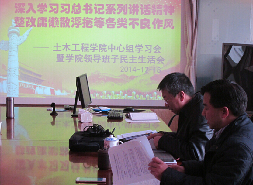 在1208会议室主持召开了主题为“深入学习习近平总书记系列重要讲话精神、整改庸懒散浮拖的各类不良作风”的中心组学习会暨学院领导班子民主生活会。学院领导班子全体成员参加会议。会议由钱永久书记主持。